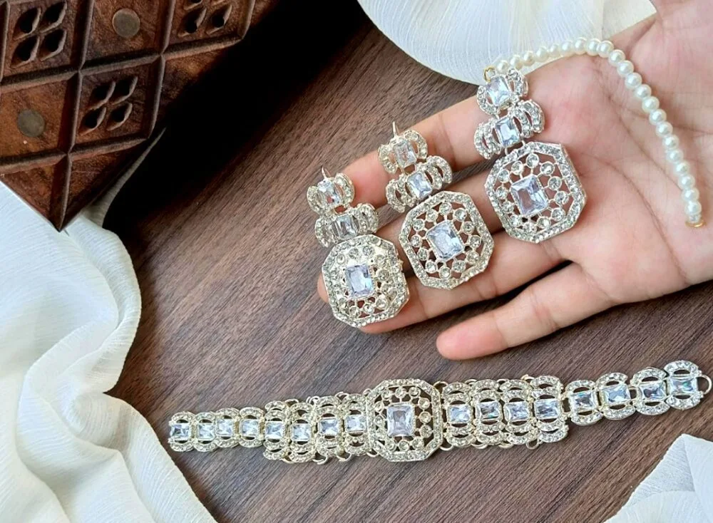 Zircon Party Wear Necklace with Earrings and Teeka